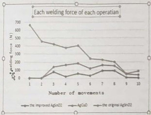 4) Die Daten der Schweißkraft bei 2000 A Hochstrom zeigen, dass das verbesserte AgSnO₂-Material in diesem Projekt eine geringe Schweißkraft aufweist und seine Schweißfestigkeit viel geringer ist als die des ursprünglichen Silberzinnoxid-Materials und des AgCuO10-Materials mit guter Schweißfestigkeit. In diesem Artikel wird das AgSnO₂-Material vorgestellt. Die Vergröberung der Oxidpartikel verbessert die Schweißfestigkeit des Materials. Das Material enthält spröde Bestandteile, um die Trennfähigkeit der Kontakte zu verbessern. Vergleicht man die Schweißkraft von AgCuO10 mit der von AgCuO10 bei 2000 A Stromstärke, kann das in diesem Artikel vorgestellte verbesserte AgSnO₂-Material die Anforderungen von Elektrofahrzeugen an die Hochstromunterbrechung von 1000–2000 A erfüllen.